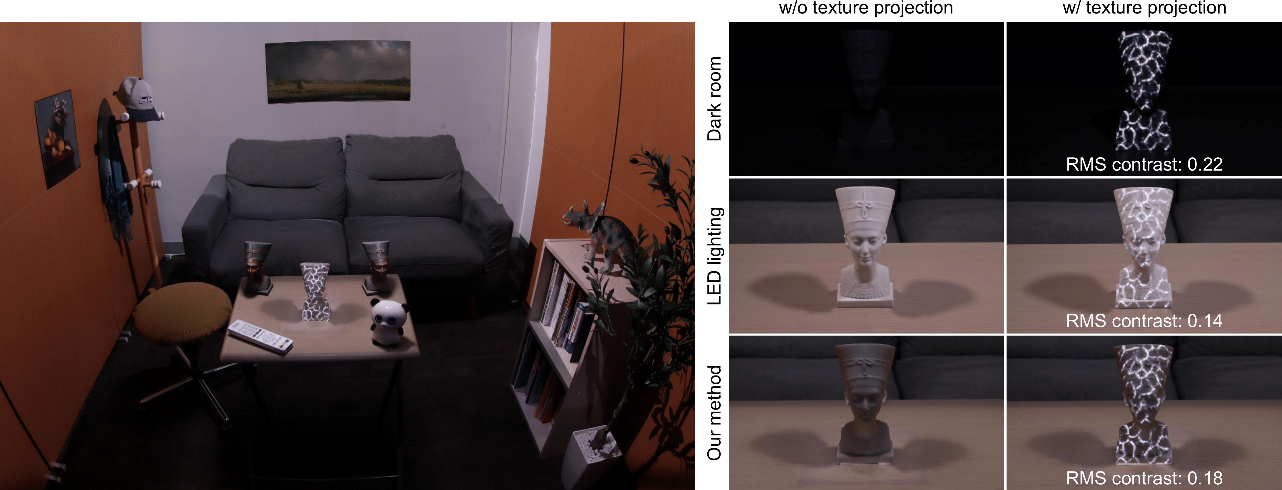 Projection mapping (PM) is a technique that enhances the appearance of real-world surfaces using projected images, enabling multiple people to view augmentations simultaneously, thereby facilitating communication and collaboration. However, PM typically requires a dark environment to achieve high-quality projections, limiting its practicality. In this paper, we overcome this limitation by replacing conventional room lighting with heterogeneous projectors. These projectors replicate environmental lighting by selectively illuminating the scene, excluding the projection target. Our contributions include a distributed projector optimization framework designed to effectively replicate environmental lighting and the incorporation of a large-aperture projector, in addition to standard projectors, to reduce high-luminance emitted rays and hard shadows-undesirable factors for collaborative tasks in PM. We conducted a series of quantitative and qualitative experiments, including user studies, to validate our approach. Our findings demonstrate t hat our projector-based lighting system significantly enhancesthe contrast and realism of PM results even under e nvironmental lighting compared to typical lights. Furthermore, our method facilitates a substantial shift in the perceived color mode from the undesirable aperture-color mode, where observers perceive the projected object as self-luminous, to the surface-color mode in PM.